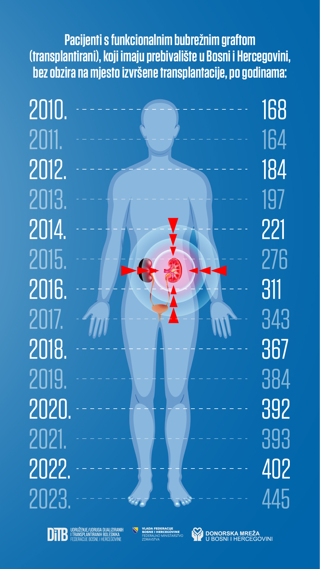 Pregled podataka od 2010. do 2023. godine pokazuje stabilan i ohrabrujući porast broja osoba koje u Bosni i Hercegovini žive s funkcionalnim presađenim bubregom. Dok je 2010. godine taj broj iznosio 168, do kraja 2023. godine narastao je na ukupno 445 pacijenata.