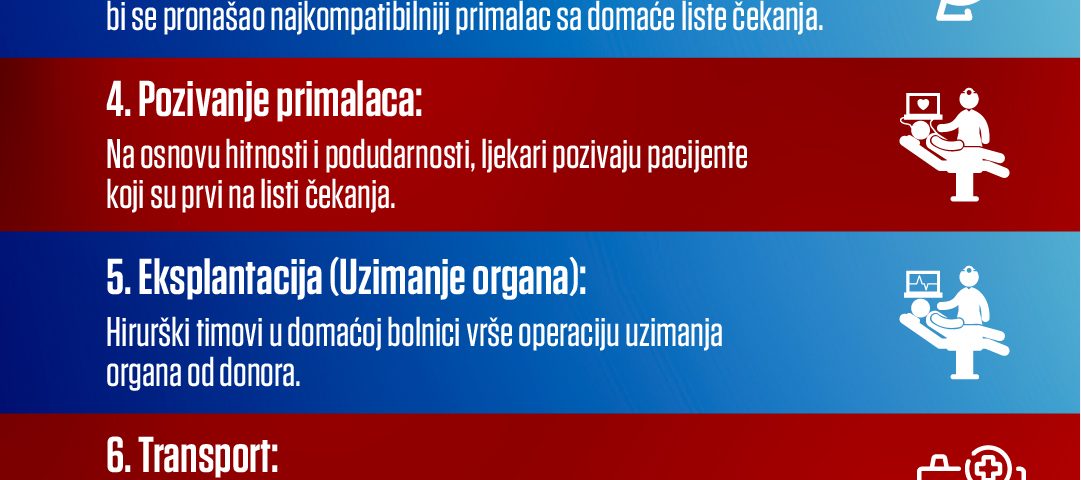 Proces transplantacije u BiH započinje medicinskom potvrdom moždane smrti i neprocjenjivim pristankom porodice za donaciju. Stručni timovi potom vrše strogu procjenu zdravlja organa i laboratorijsku tipizaciju tkiva kako bi se pronašao najkompatibilniji primalac s liste čekanja. Nakon pozivanja pacijenta, slijedi hirurška eksplantacija i hitan transport organa do kliničkog centra gdje se obavlja transplantacija. Cijeli put završava intenzivnim oporavkom pod strogim nadzorom ljekara kako bi tijelo uspješno prihvatilo novi organ.
