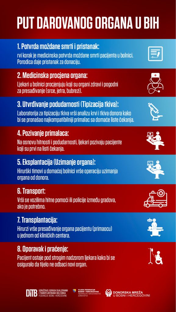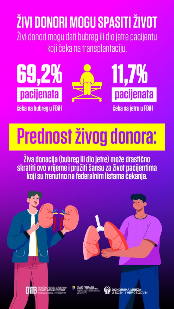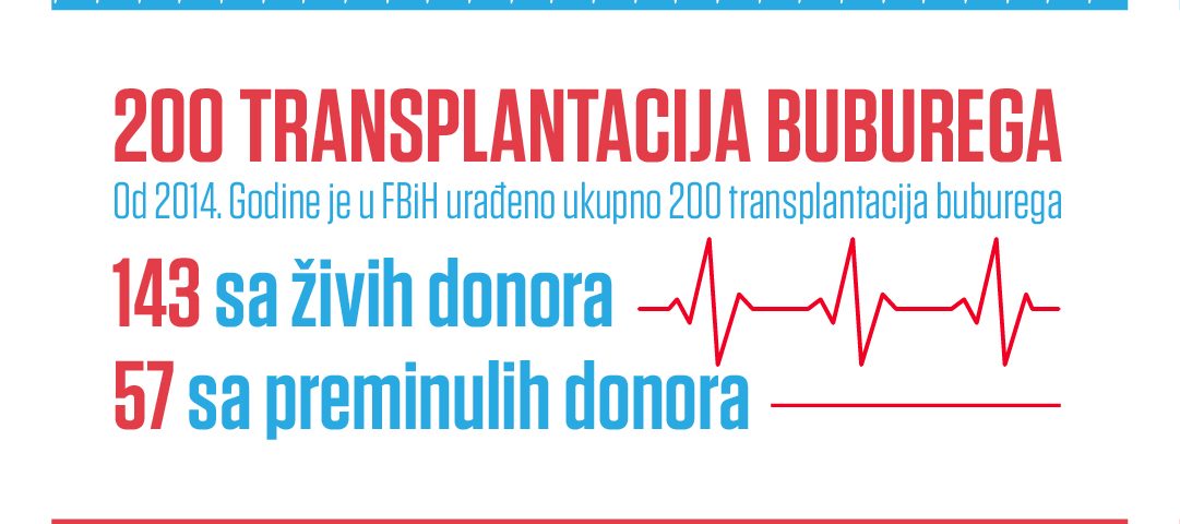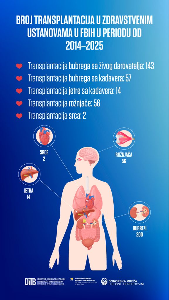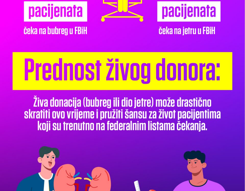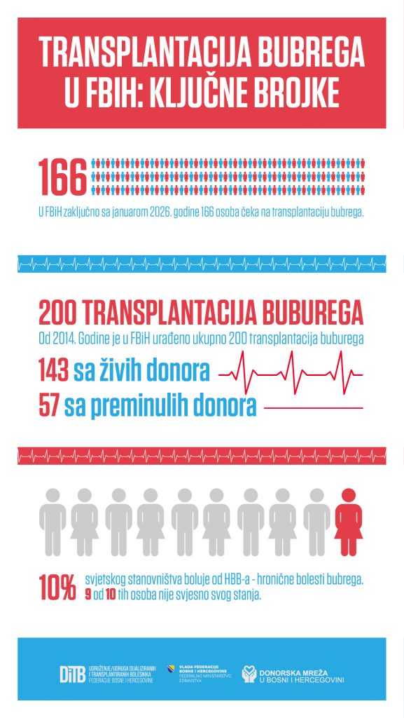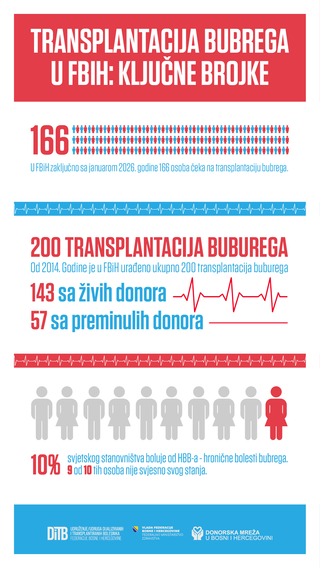 U Federaciji BiH, zaključno s januarom 2026. godine, 166 osoba i dalje se nalazi na listi čekanja za transplantaciju bubrega. Od 2014. godine ukupno je urađeno 200 transplantacija, od kojih je 143 realizovano zahvaljujući živim donorima, dok je 57 urađeno sa preminulih darivatelja. Zabrinjava podatak da na globalnom nivou 10% stanovništva boluje od hronične bolesti bubrega (HBB), a čak 9 od 10 tih osoba uopšte nije svjesno svog stanja.